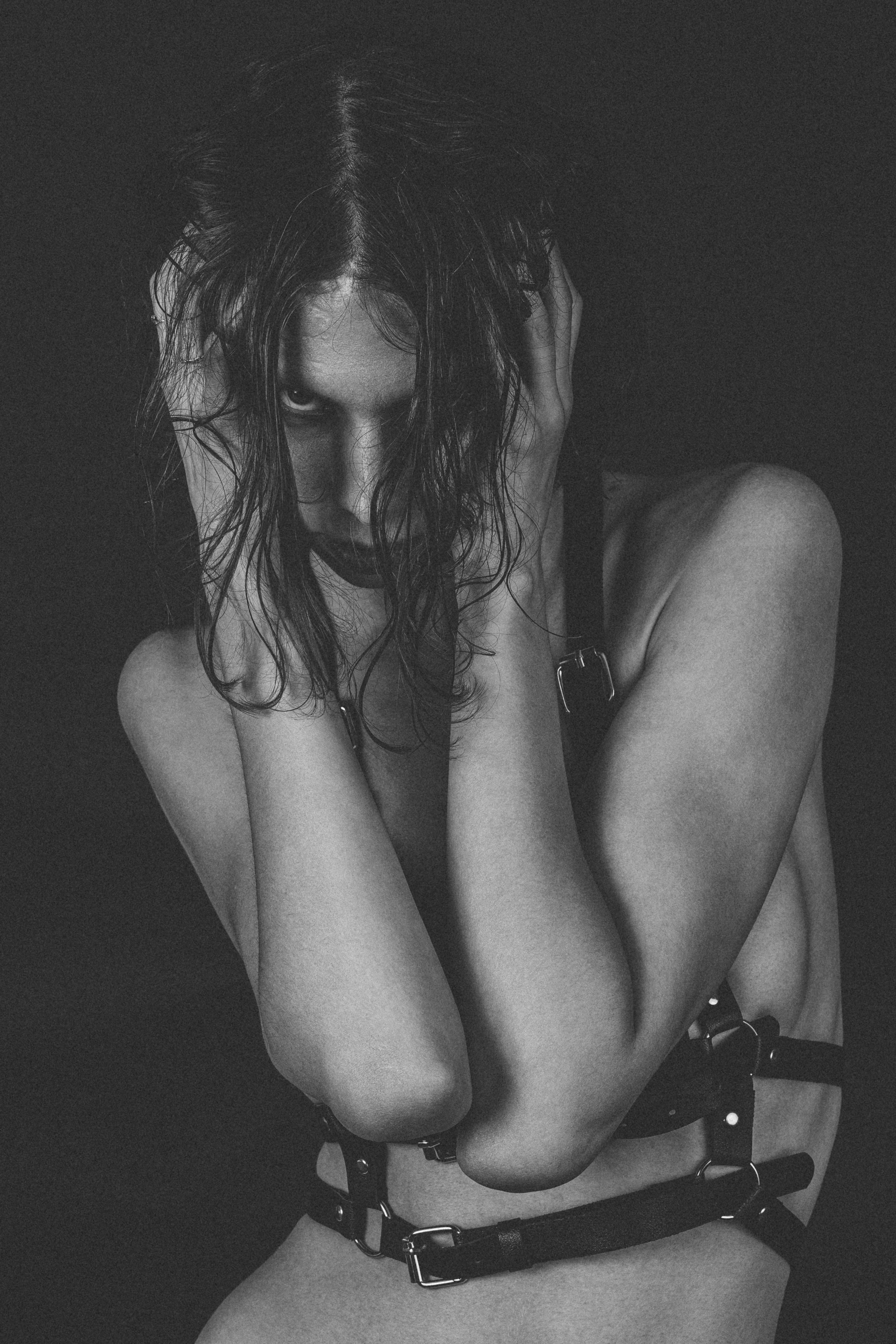 The chaotic peak of the internal storm. A gesture of pure anguish is powerfully contradicted by a gaze of piercing, undeniable lucidity, making the viewer a direct witness to the turmoil.