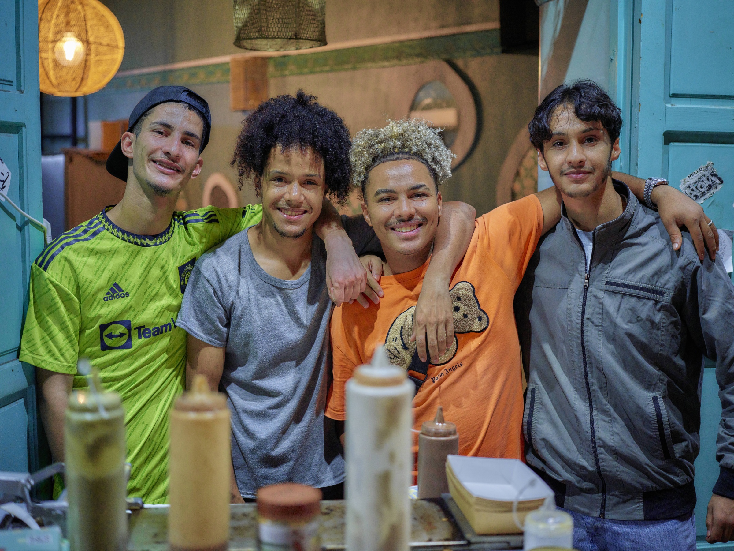 Dans le souq de Marrakesh, un groupe d'amis se retrouve, en vendant aussi des crêpes aux passants. Spontanément, ils se sont entrlacés pour prendre cette image.