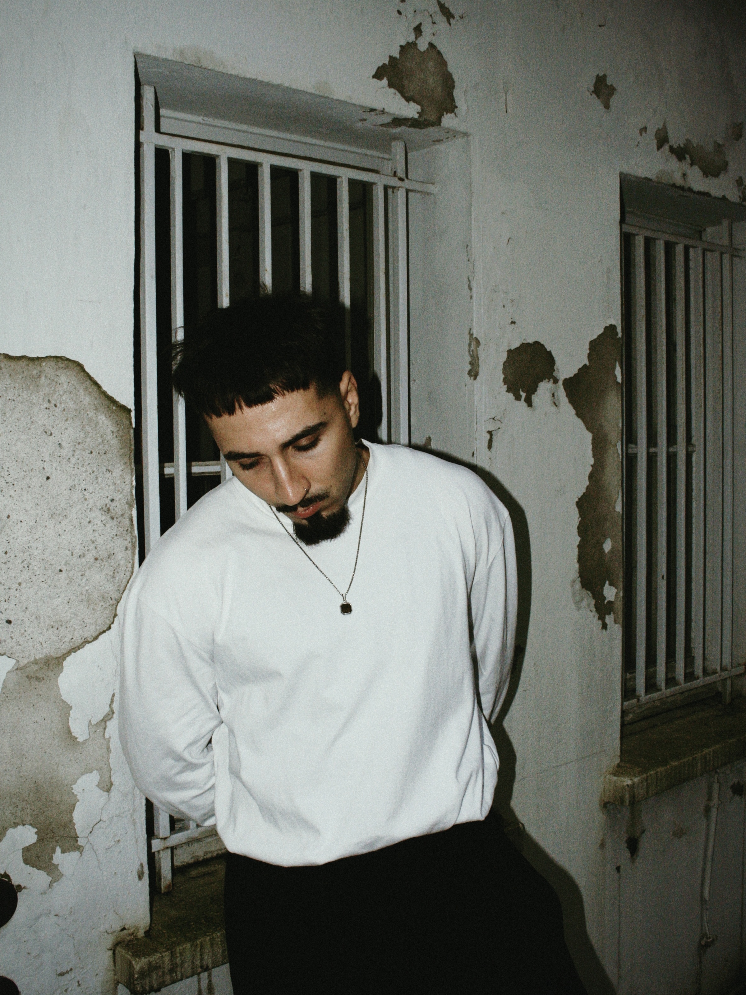 Back to the galleryMurs délabrés, barreaux, ambiance lugubre, tête baissé, pull blanc, mains attachées dans le dos