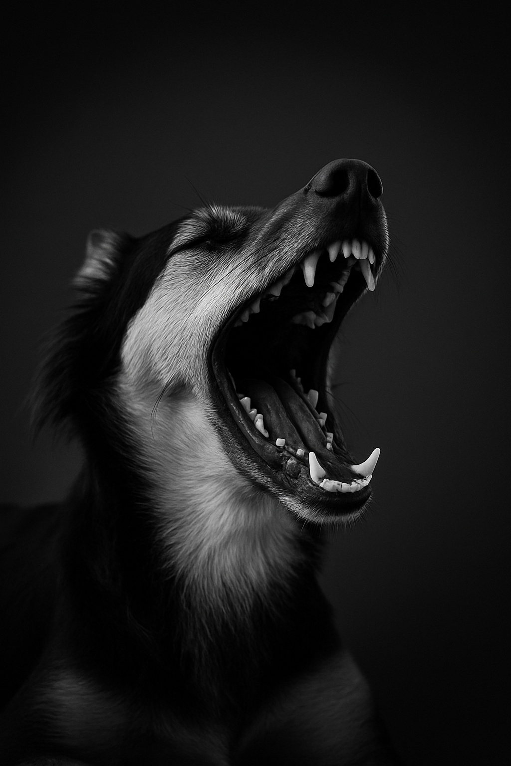 Ein ausdrucksstarkes Schwarz-Weiß-Porträt eines Hundes, der mit weit geöffnetem Maul in die Dunkelheit „ruft“. Die Aufnahme fängt die rohe Energie, Kraft und Emotion des Tieres in einem einzigen Moment ein. Durch das kontrastreiche Licht und die feinen Details des Fells und der Zähne entsteht eine dramatische, fast skulpturale Wirkung. Eine kraftvolle Darstellung von Ausdruck,