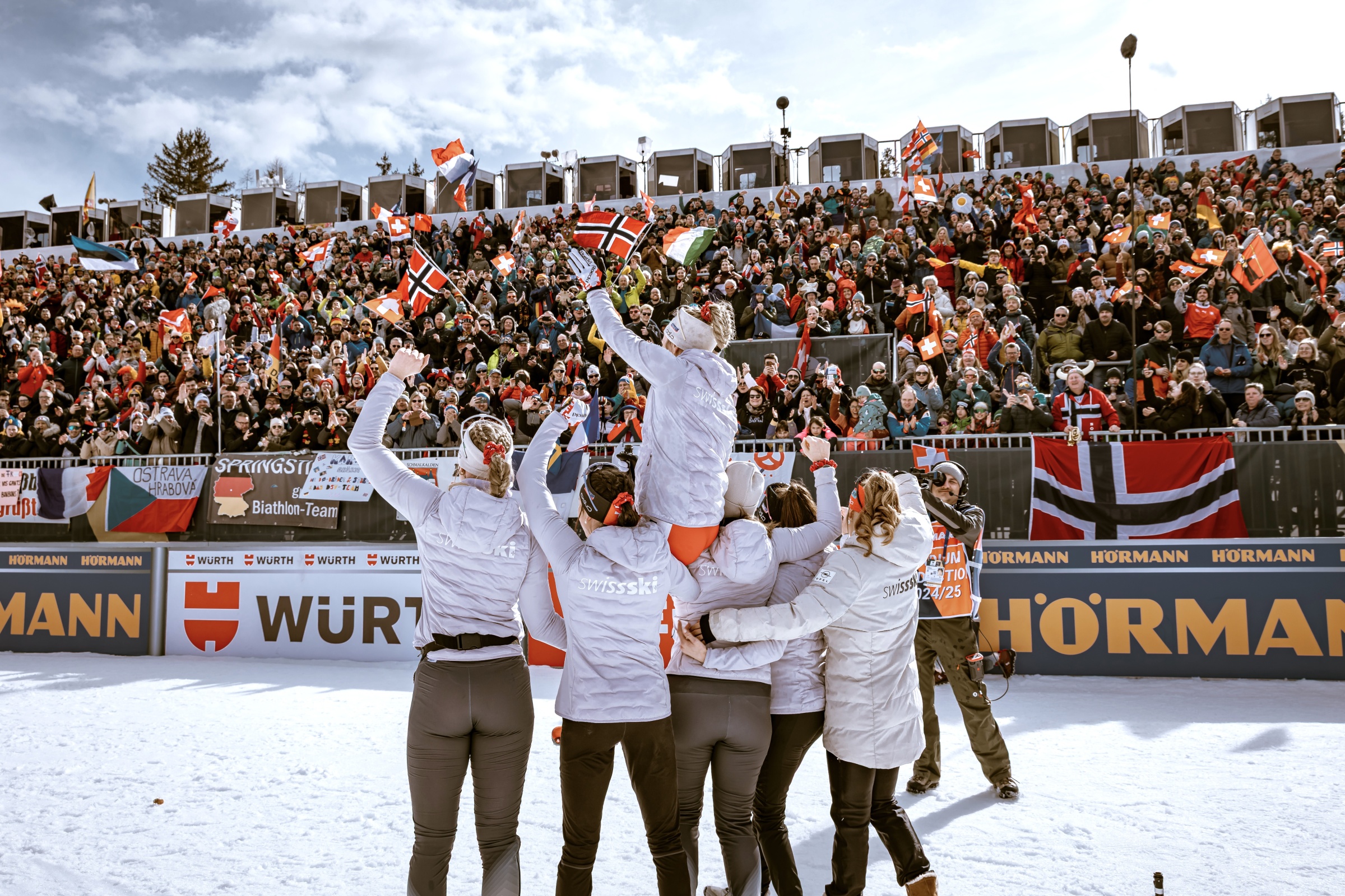 Elisa Gasparin an ihrer letzten Biathlon WM zuhause auf der Lenzerheide. Nach ihrem letzten Rennen wurde Sie von Swiss Ski und dem Heimpublikum gebührend verabschiedet! Getragen von ihren Teamkolleginnen & Staff lässt sich Elisa vom Heimpublikum feiern.