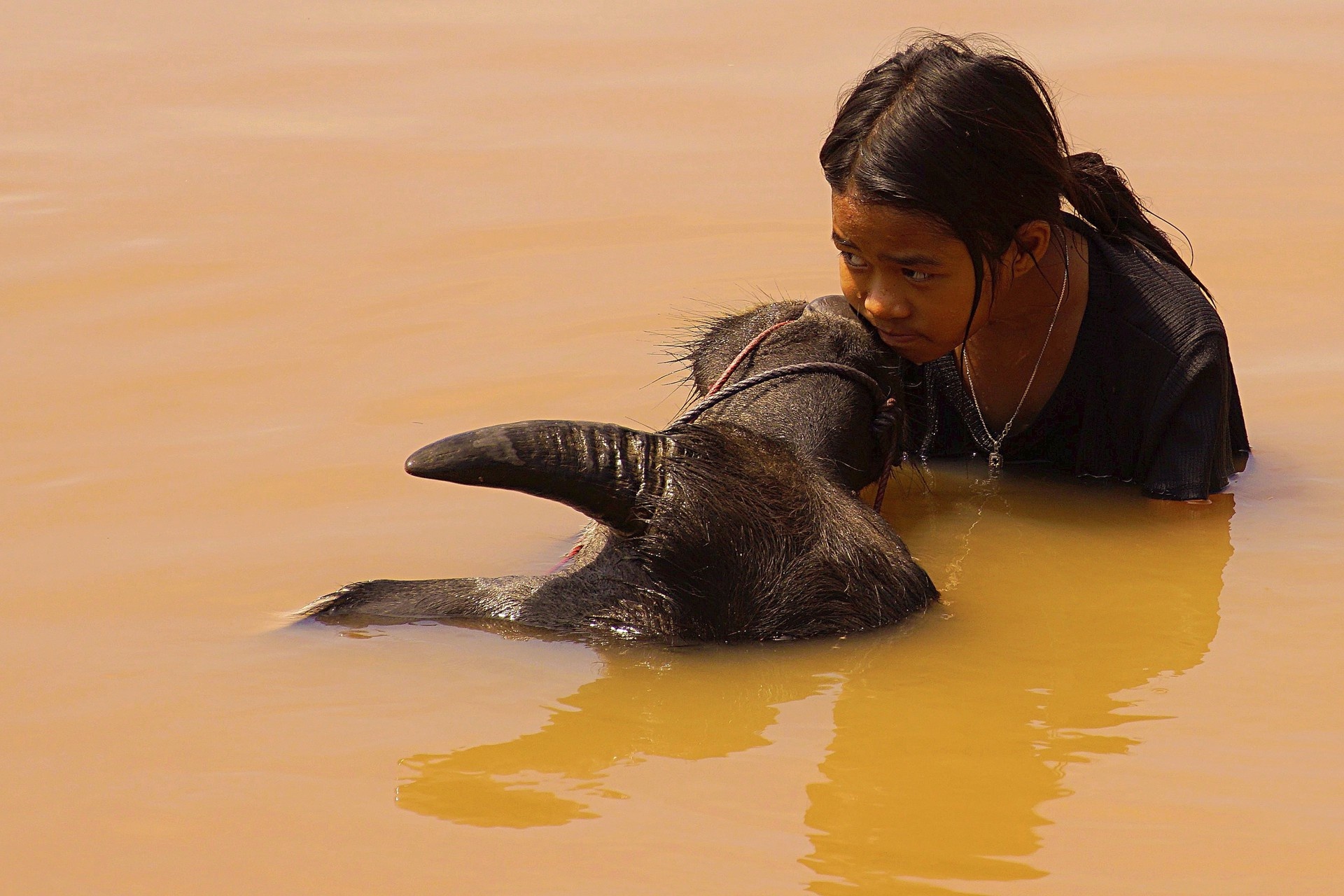 Back to the galleryMädchen in Laos im Mekong-Fluss hütet den Wasserbüffel ihres Vaters. Immer nach der Schule.