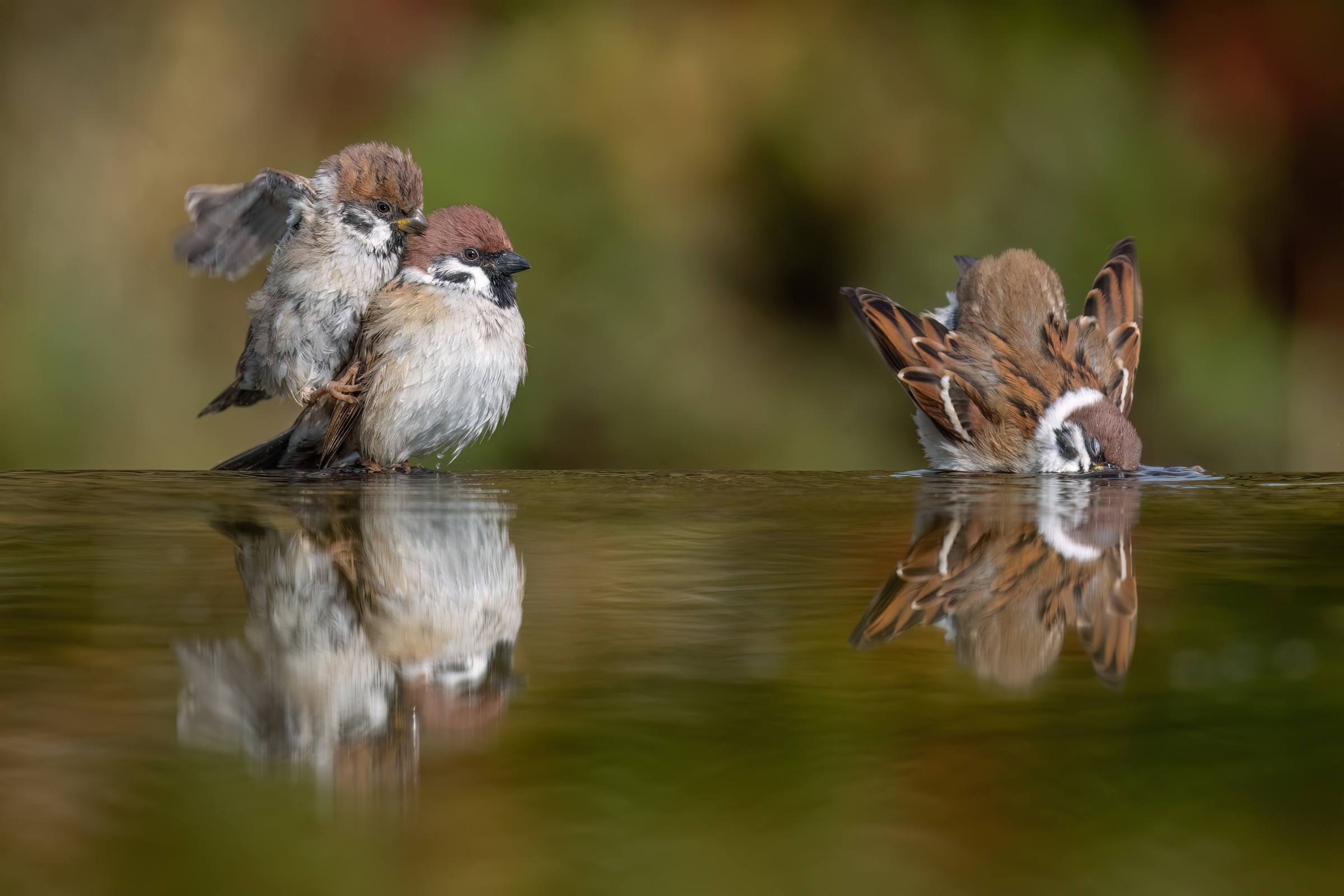 Back to the galleryDer junge Feldspatz zögert zitternd auf Mutters Rücken der Vater zeigt vor wie die Gefiederreinigung gemacht wird.