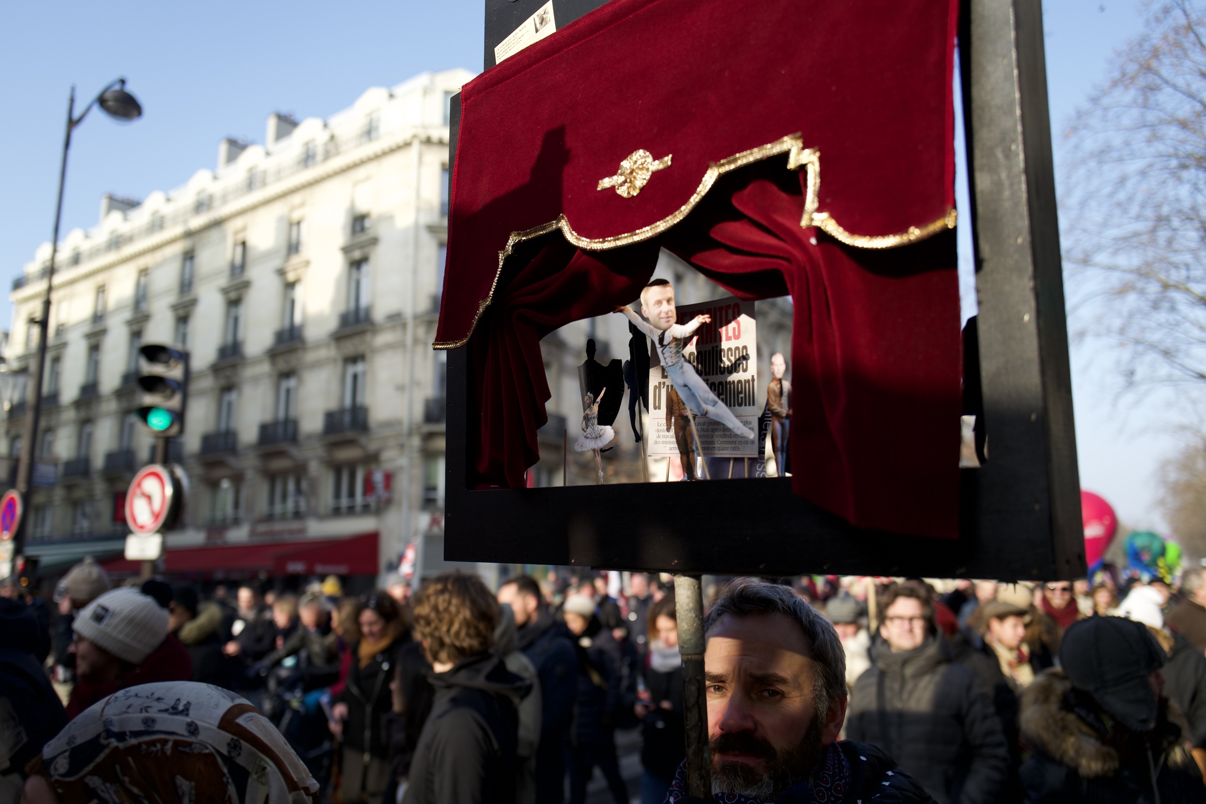 In Paris 2020 aufgenommen. Auch das Opernhaus- Personal demonstriert gegen Emanuel Macrons Sparpläne. Dieser baumelt als Pappfigur über dem Streikenden. (Leicaq)