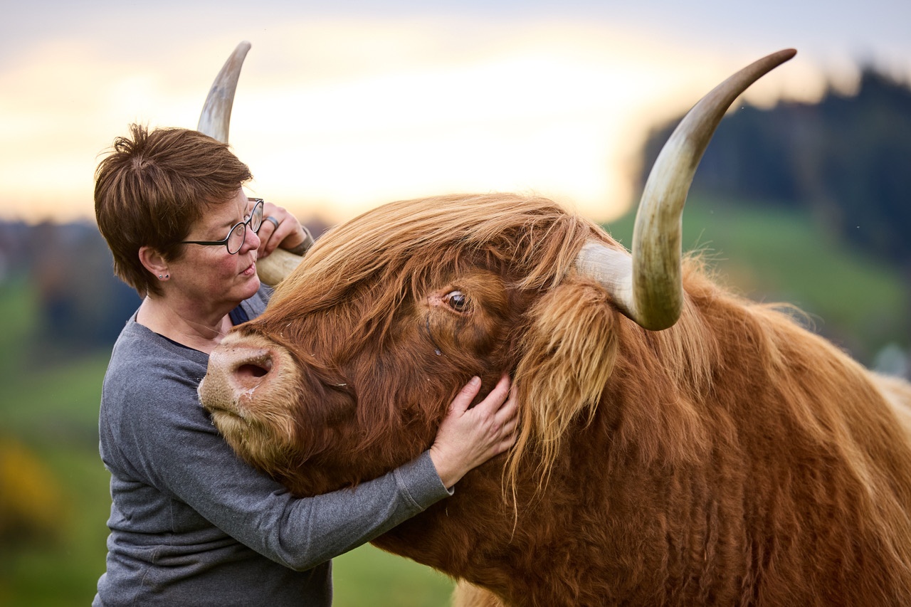 Dieser Ochse wurde mit der Flasche grossgezogen und holt sich seine Streicheleinheit.