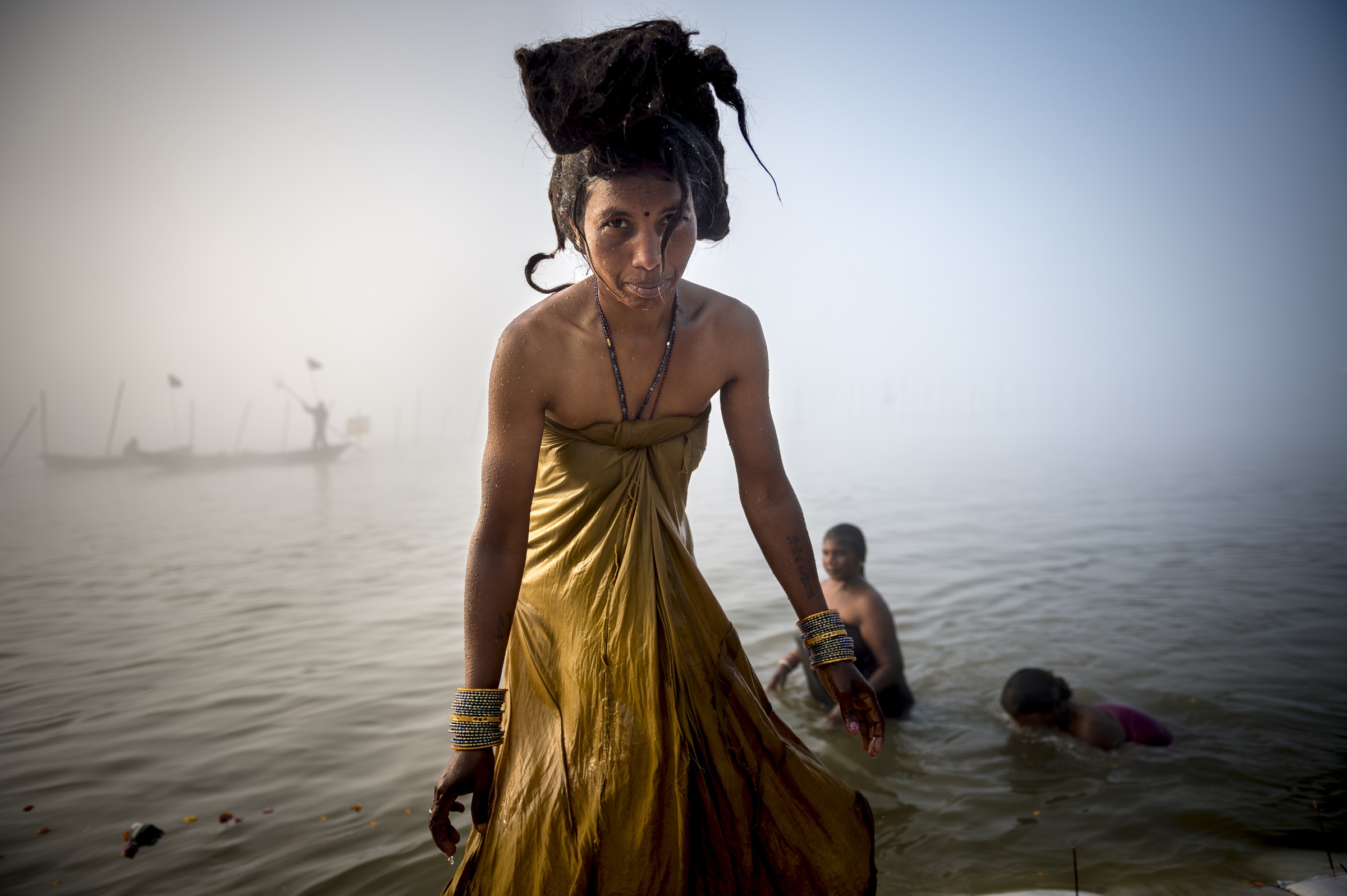 Im dichten Morgennebel des Maha Kumbh Mela 2013 steht eine seltene weibliche Asketin im heiligen Wasser, ihr Körper noch feucht vom rituellen Bad. Mit kunstvoll hochgebundenem Haar, einfachen Armbändern und einem locker drapierten Tuch wirkt sie zugleich streng, würdevoll und vollkommen in ihren spirituellen Weg versunken. Weibliche Naga-Asketinnen sind äußerst selten, und ihre Präsenz bei diesem gewaltigen Pilgerfest gilt als außergewöhnlicher Anblick. Hinter ihr verschwimmen weitere Pilger im Nebel, während Boote schemenhaft im Hintergrund auftauchen.