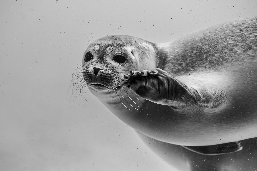 J‘ai pris cette photo a Norden (Allemagne du Nord) en visitant le Centre de sauvegarde des phoques. Ici les jeunes phoques qui ont perdu leur parents sont sauvés et élevés et relâchés quand ils deviennent indépendants. Le regard du petit phoque transmet un sense de tristesse et semble chercher ses parents au de là de la vitre.