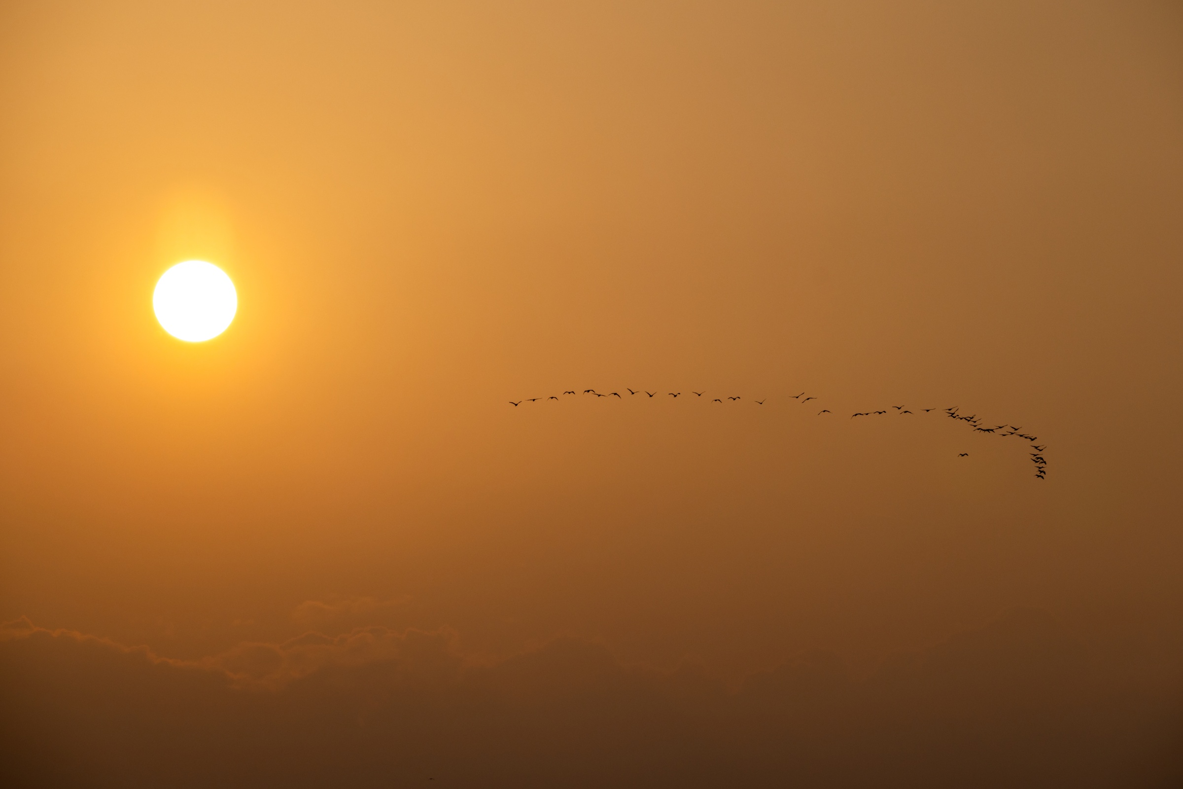 Dans les dernières lueurs de la journée, une volée de cormorans s'en va rejoindre le lac de Neuchâtel pour s'y reposer.