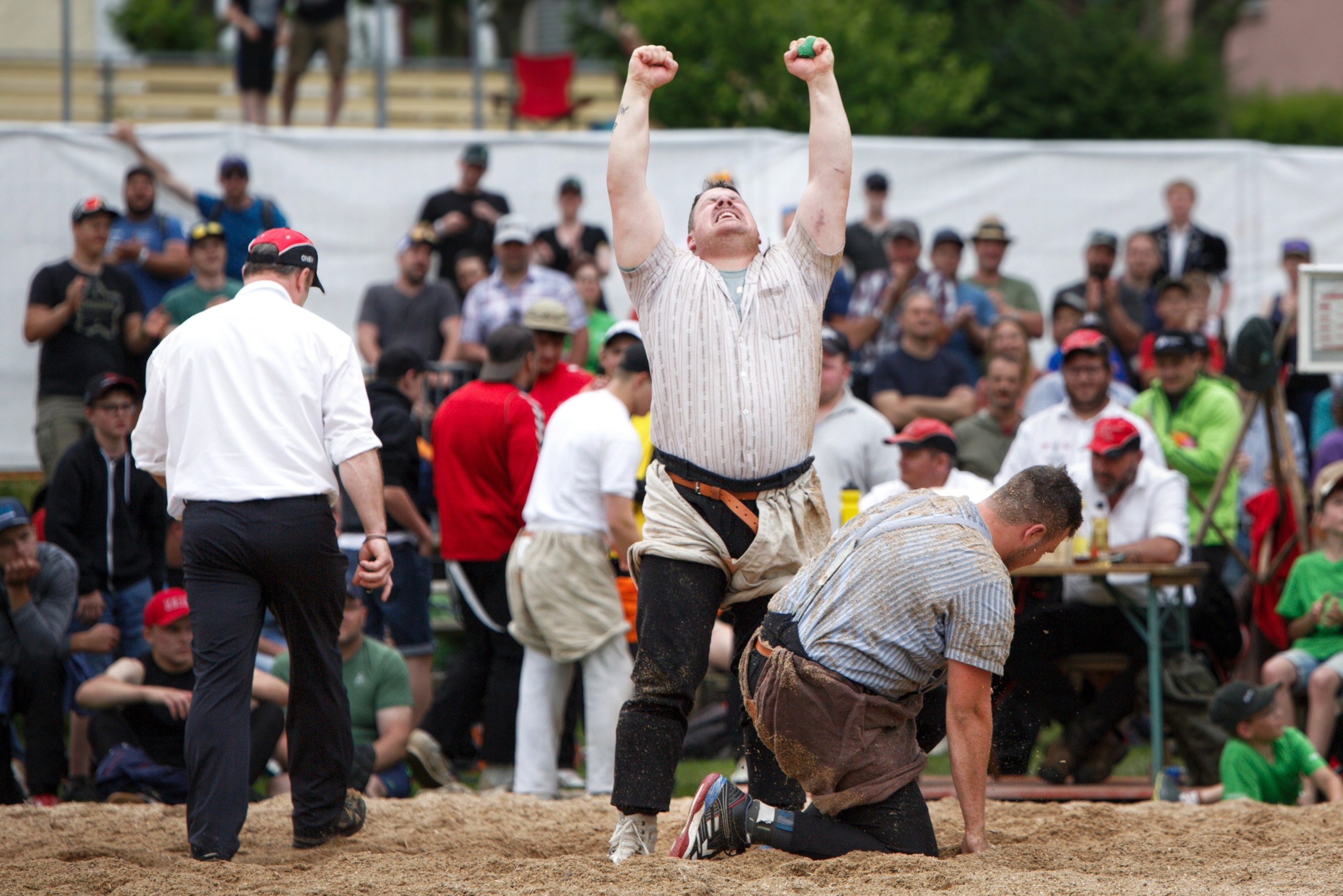 Back to the galleryMomentaufnahme eines Schwingfestes. Der Sieger jubekt, der Verlierer ist sich seiner Niederlage bewusst. Die Zuschauer applaudieren.