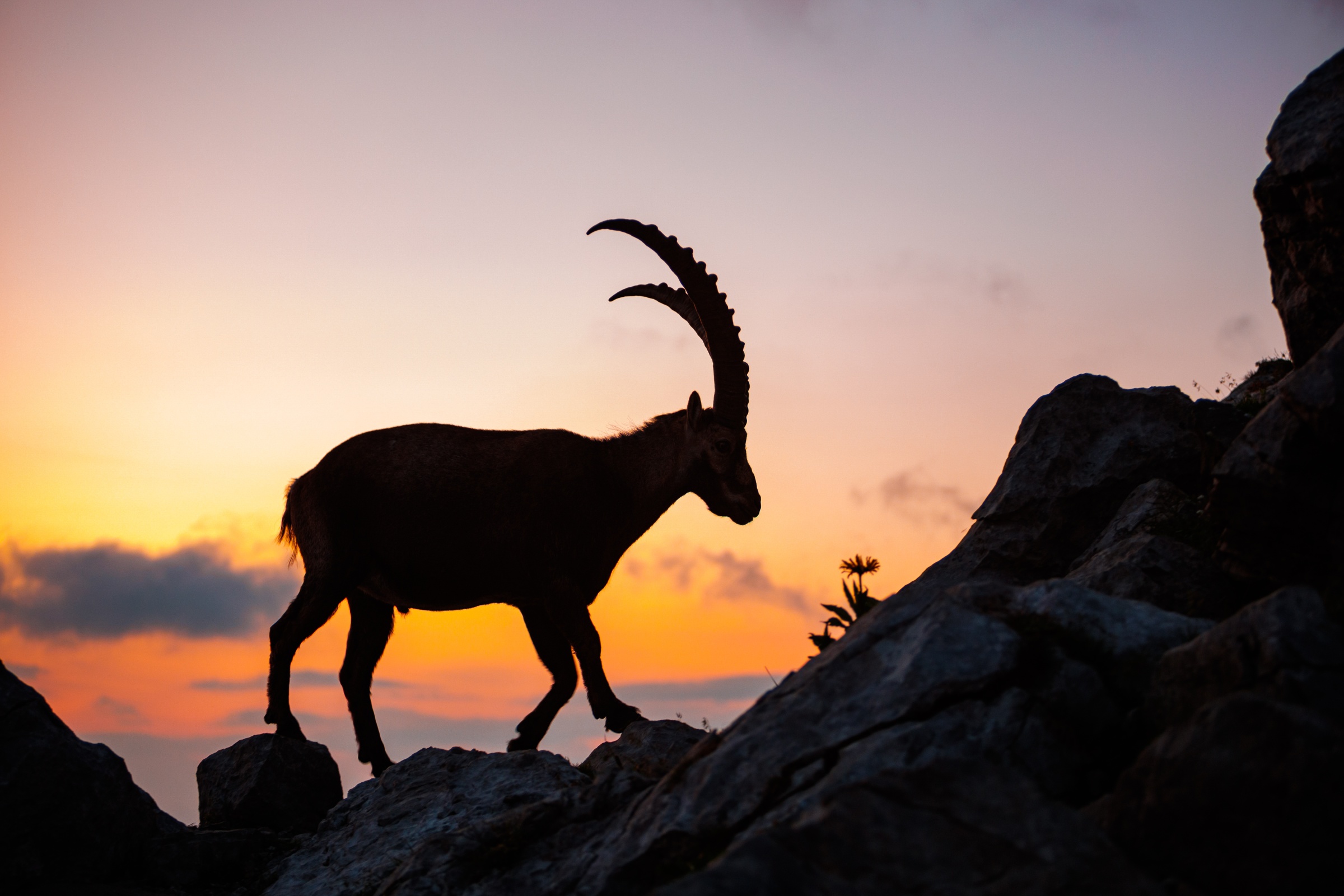 Back to the galleryEin einsamer Alpensteinbock klettert majestätisch über Felsen. Aufgenommen im Alpstein, Appenzell, Schweiz.
