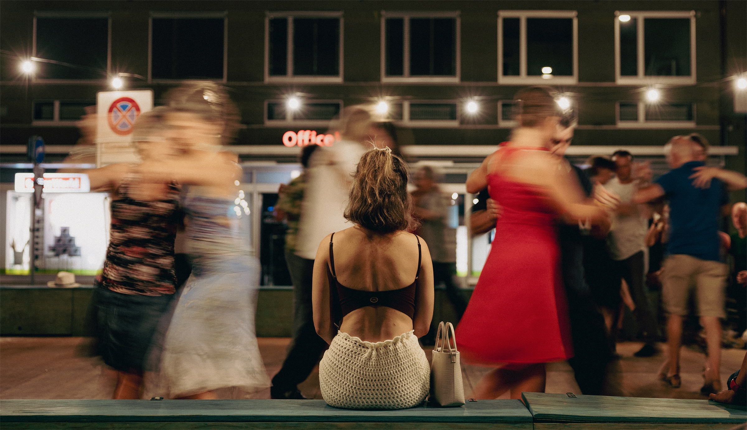 Un soir d'été, au cœur de la ville de Berne, une femme est assise, seule, observant les autres danser au rythme de la musique. Les danseurs autour d’elle sont flous, comme un monde qui vibre sans elle, gardée à l'écart de la joie qui l'entoure. L’image montre le contraste entre mouvement et immobilité, entre collectivité et isolement, et capture un instant où la fête et la solitude coexistent dans le même espace.