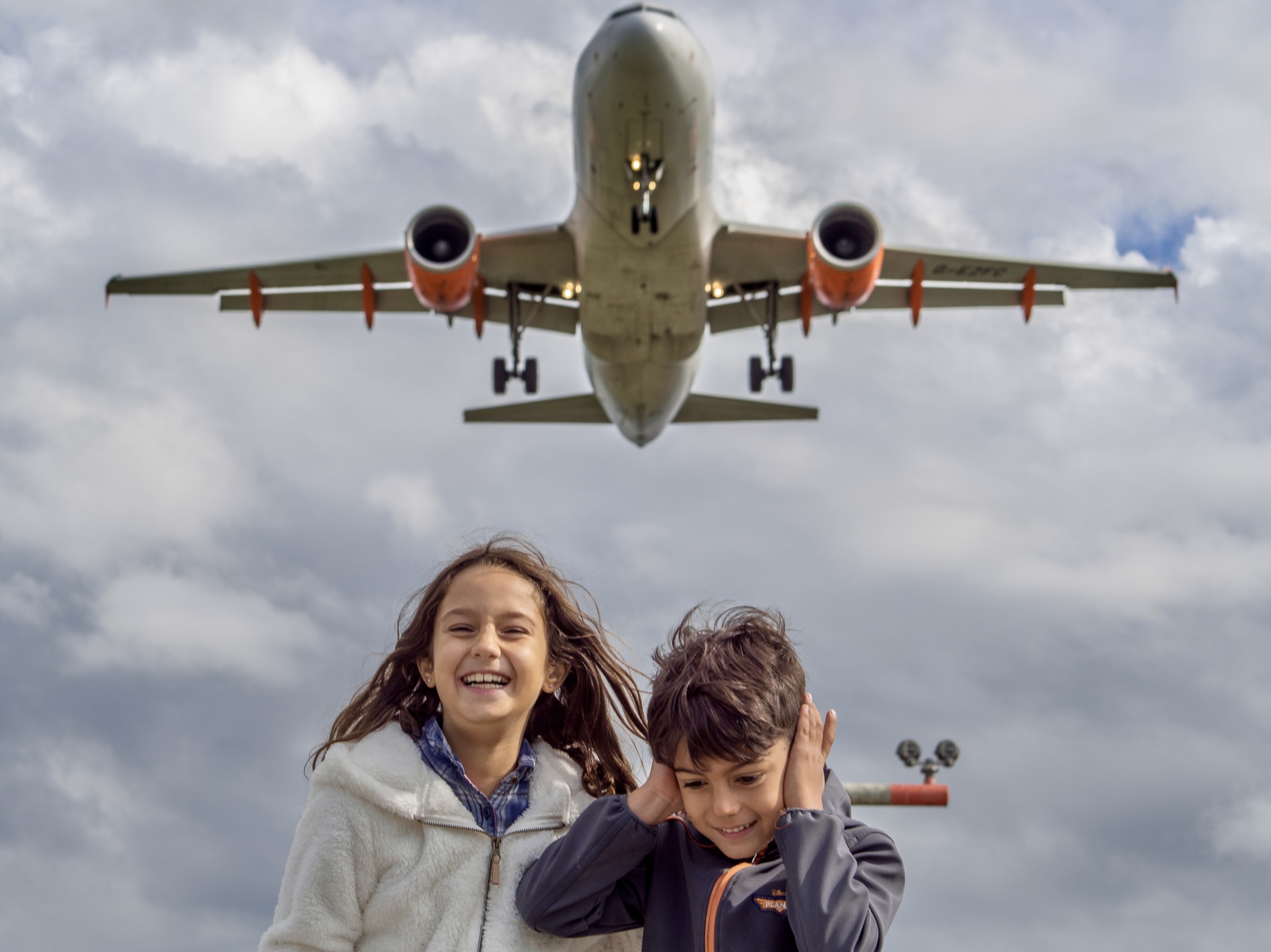 Das Mädchen lacht fröhlich und genießt den Moment, während der Junge sich lachend die Ohren zuhält.