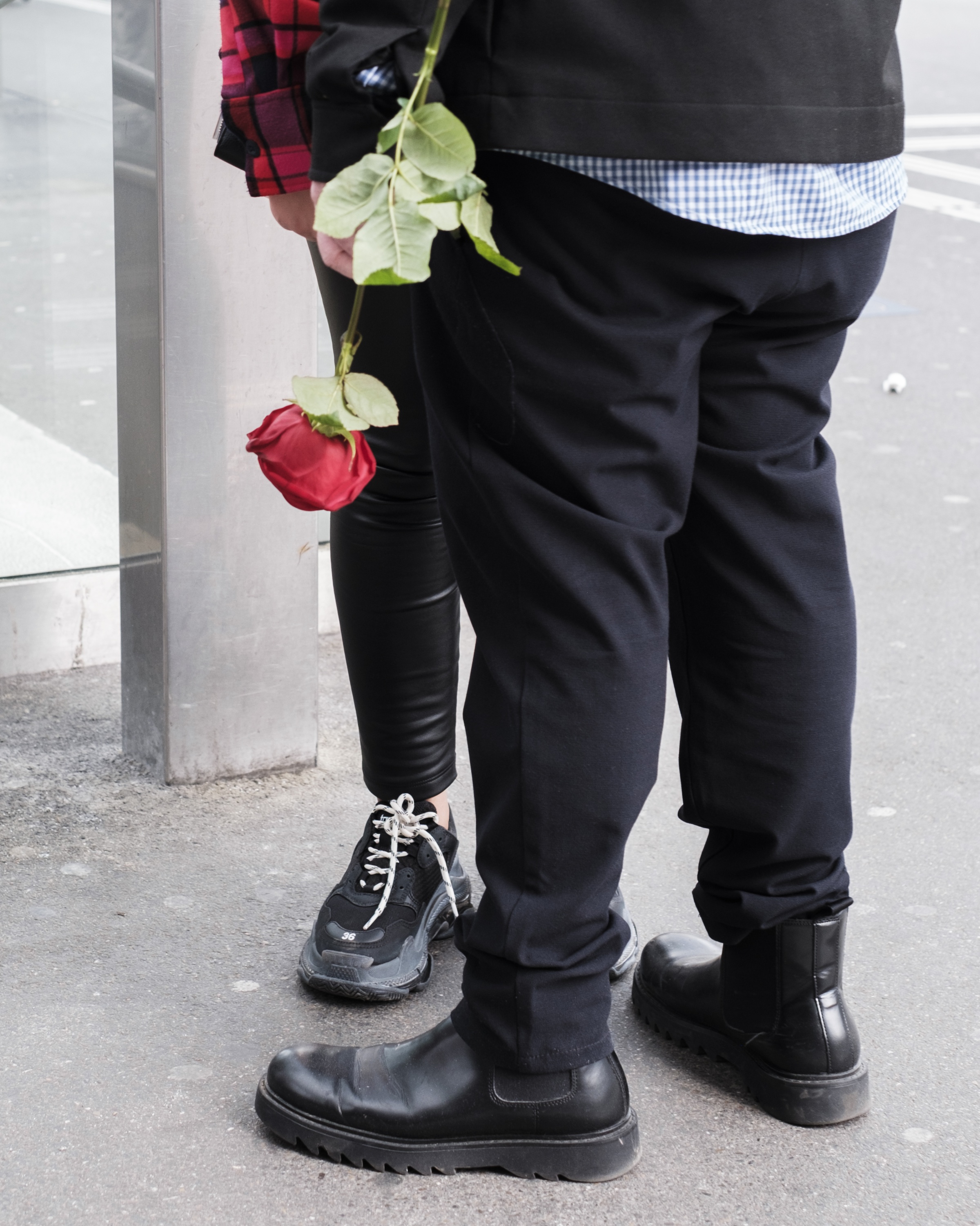Ein junger Mann wartet am Bahnhof mit einer roten Rose in der Hand auf seine Freundin