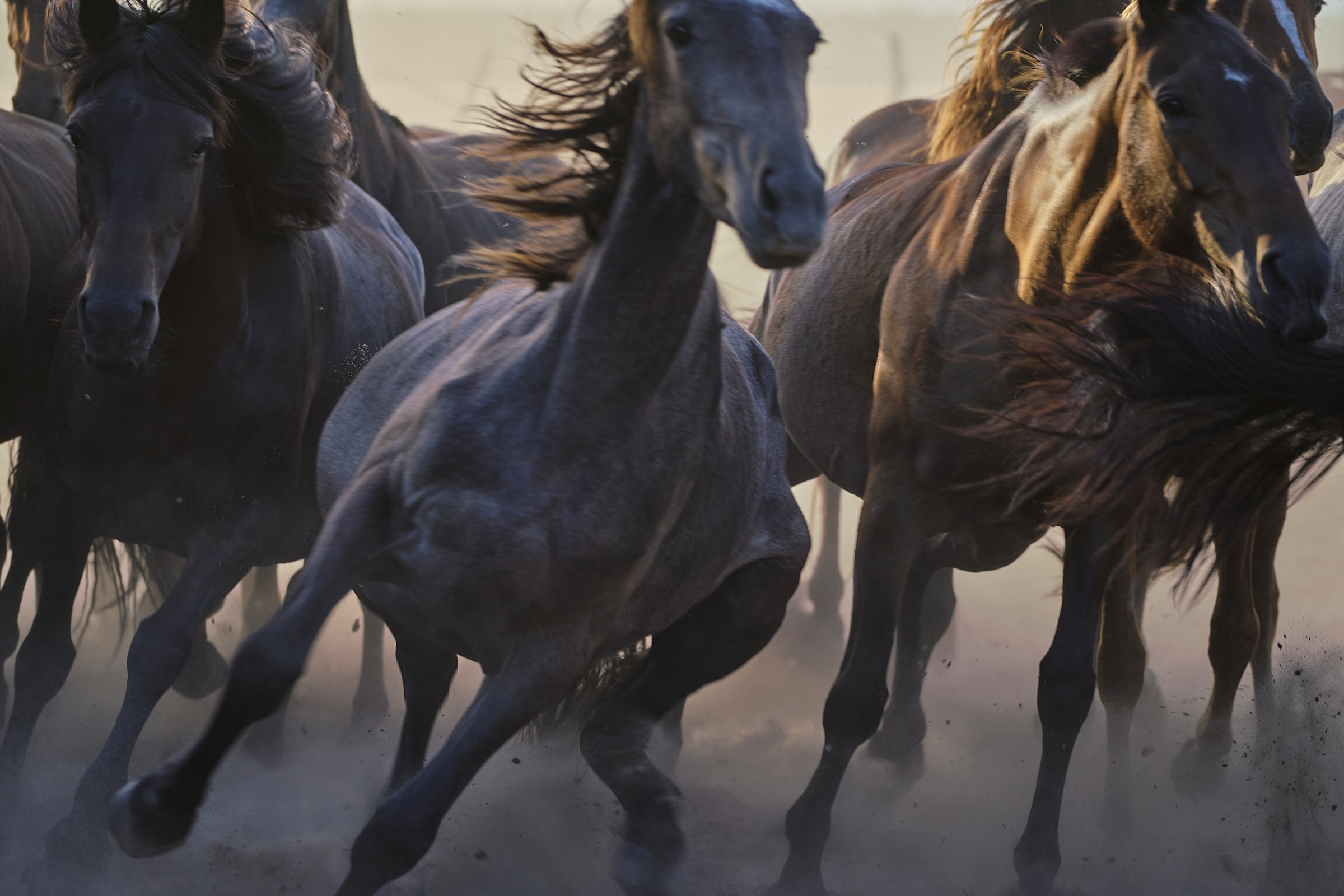Eine Herde halbwilder Stuten, die im Korall einer argentinischen Familienfarm zur Kontrolle zusammengetrieben wurde, galoppiert direkt auf mich zu. Pferde sind sehr aufmerksam und rennen einen nicht einfach um!