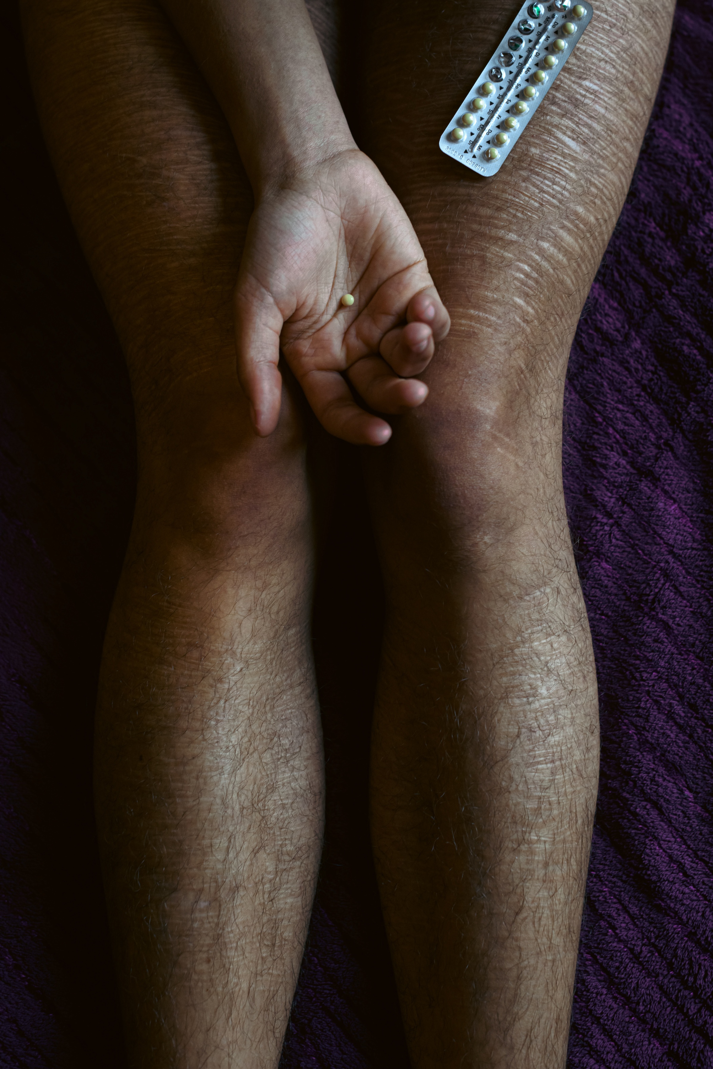 Das Bild zeigt einen Körper, der seine Geschichte trägt – Emotionen eingeschrieben in Haut. Die Emotionen entstehen aus der Erfahrung, in einem Körper zu leben, der sich fremd anfühlt, aus dem Bedürfnis, etwas zu verändern, um überleben zu können: «Mit 10 Jahren wusste ich, dass ich die Menstruation nicht bekommen darf. Warum, konnte ich damals noch nicht verstehen, aber ich wusste, ich würde es nicht überleben. In meiner Kindertheorie ging ich davon aus, dass dünne Menschen die Menstru- ation erst spät oder gar nicht bekommen würden und hörte unter anderem des- halb auf zu essen. Es folgten viele Jahre, in denen Anorexie und Selbstverletzung mein Leben bestimmten. Eine Antwort für das Warum hatte ich keine. Als ich nach einem Jahr, in dem es mir zum ersten Mal besser ging, trotzdem zu menst- ruieren begann, fiel alles in mir zusammen. Monatliche Suizidversuche und noch immer keine Antwort. Als ich schliesslich am Ende meiner Kraft war, bat ich um irgendeine Entlastung dieser Situation und mein Behandlungsteam entschied, dass die Pille, die geeignete Lösung war. So musste ich die Menstruation nur noch ale paar Monate durchstehen und in den Augen der Therapeut*innen mich «daran gewöhnen». Aber das passierte nie. Ich versuchte ales, um meinen Kopf davon zu überzeugen, dass es nichts Schlimmes ist, dass es normal ist, dass es Menschen während der Zeit nicht gut geht und dass es auch eine gewisse Schönheit in sich trägt. Aber jedes Mal, wenn ich die Pille für eine Woche abset- zen musste, traf es mich mit voller Wucht. Mein Körper machte alles, was für mich unaushaltbar war und ich konnte nur im Bett liegend warten, bis es vorbei war. In der Hoffnung, dass die schlimmen Gedanken und Gefühle nicht die Oberhand gewinnen.» Die Hand mit der Pille ist ein stiller Ausdruck von Hoffnung und Kontrolle zugleich: Hoffnung auf Erleichterung, Kontrolle über einen Körper, der nicht dem inneren Empfinden entspricht. Doch auch diese Pille war keine Befreiung, sondern nur eine Verschiebung des Unerträglichen. Emotionen lösen viele Handlungen aus – Vermeidung, Selbstverletzung, Medikamente – alles Versuche, ein Stück Kontrolle zurückzugewinnen. Und doch bleibt die Frage – lässt sich Emotion wirklich kontrollieren, oder nur ihr Auslöser? Das Bild hält diese Ambivalenz fest und zeigt, wie tief Emotionen in Körper und Identität eingreifen.