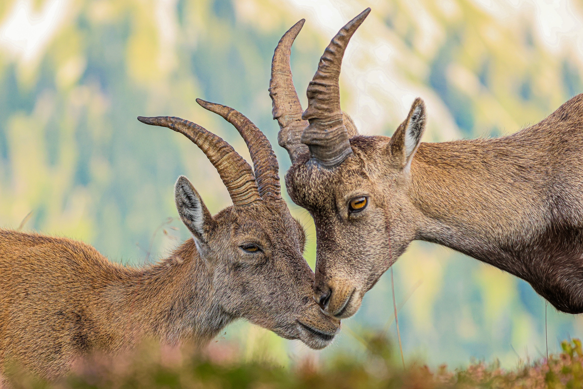 Zwei Alpensteinböcke stehen auf einer Bergwiese und berühren sich mit den Köpfen. Der Moment zeigt ihr ruhiges und friedliches Verhalten in der freien Natur. Im Hintergrund sind verschwommen die Farben der Alpenlandschaft zu sehen.
