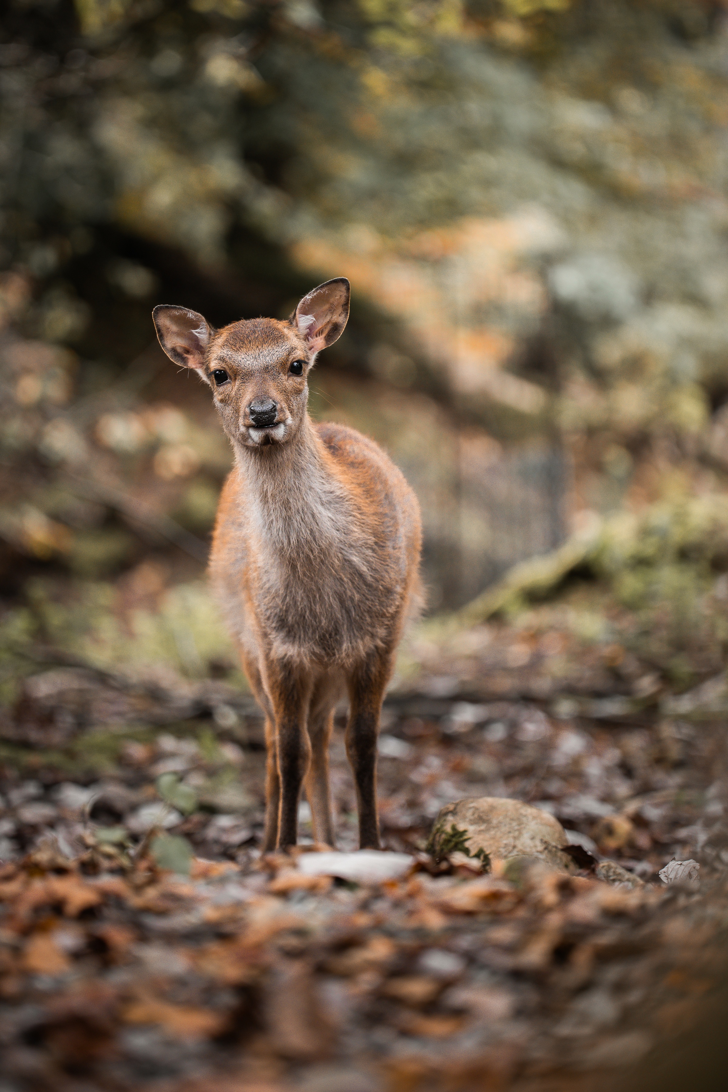 Mit grossen, neugierigen Augen steht das junge Sikahirsch-Kitz still im weichen Licht des Waldes. Zwischen Herbstlaub und sanften Farben strahlt es eine zerbrechliche Ruhe und kindliche Reinheit aus. Ein Moment voller Stille, Sanftmut und Vertrauen. Die pure Essenz unberührter Unschuld.